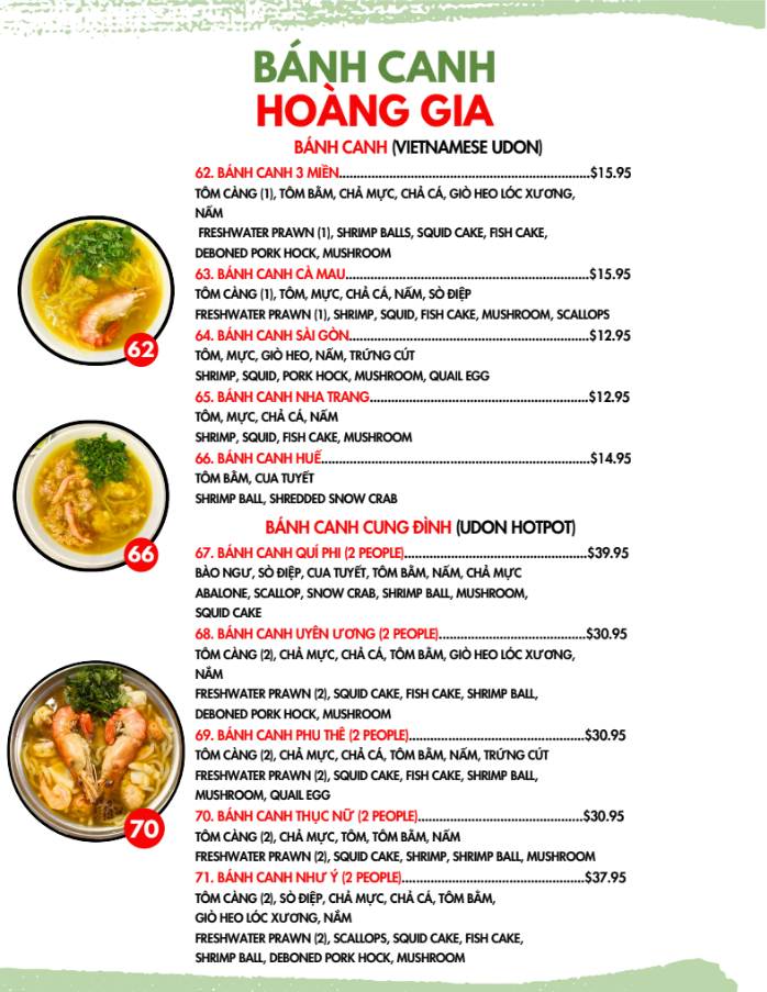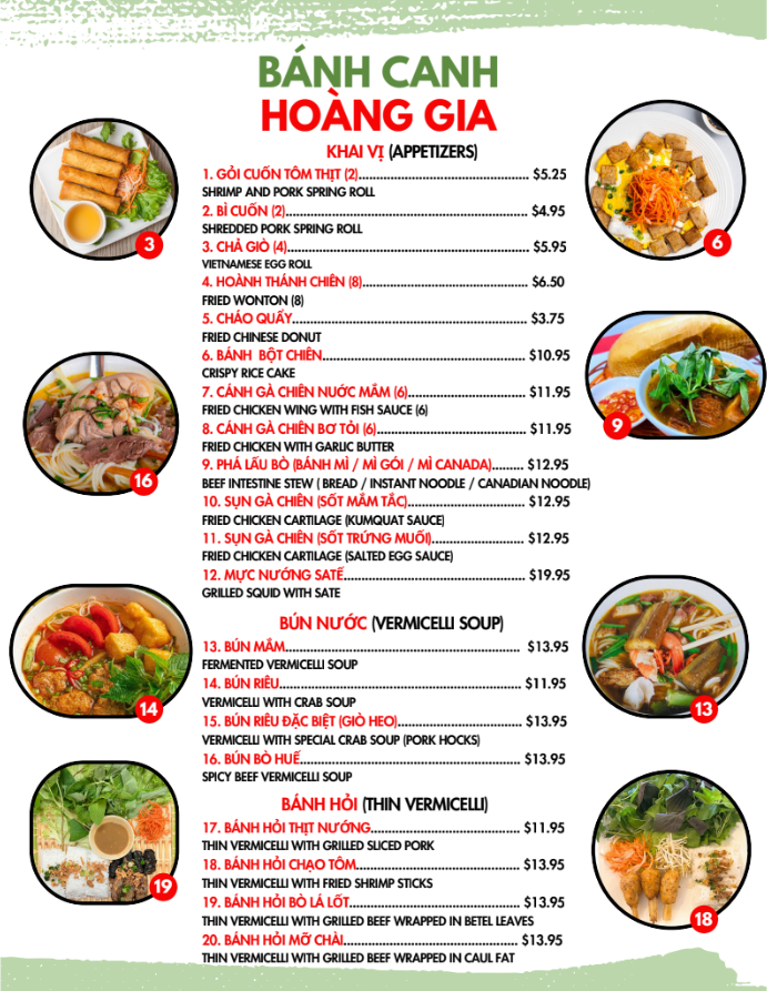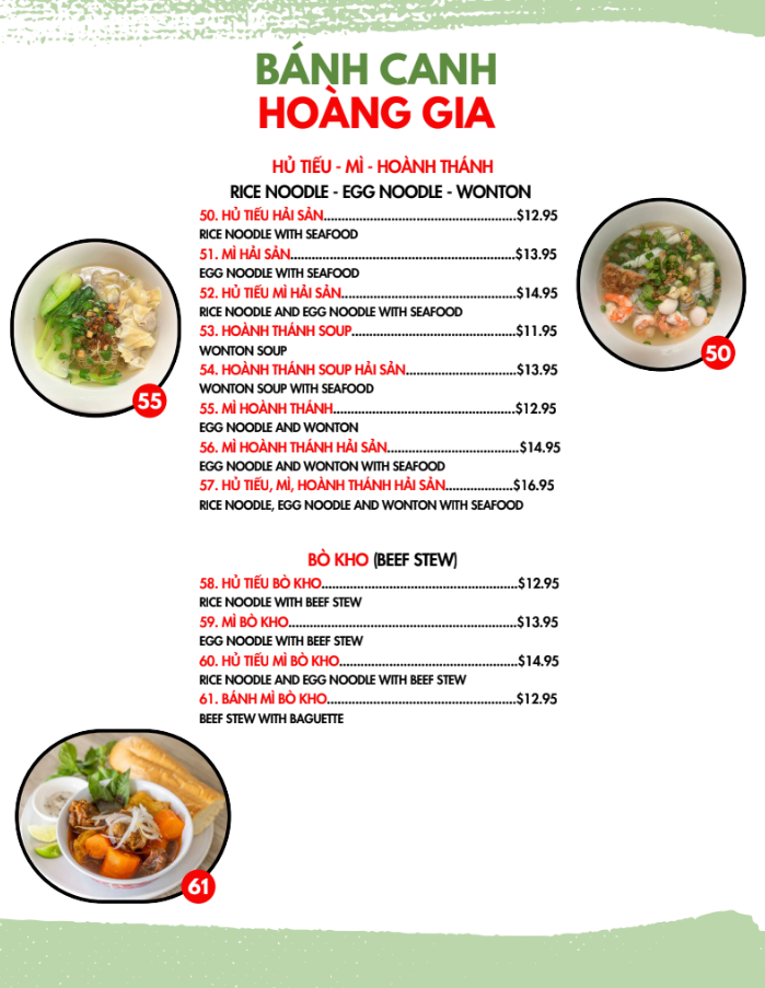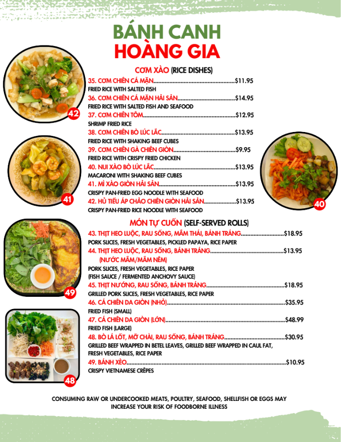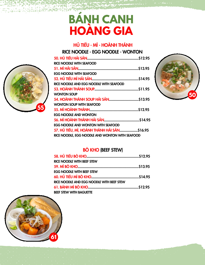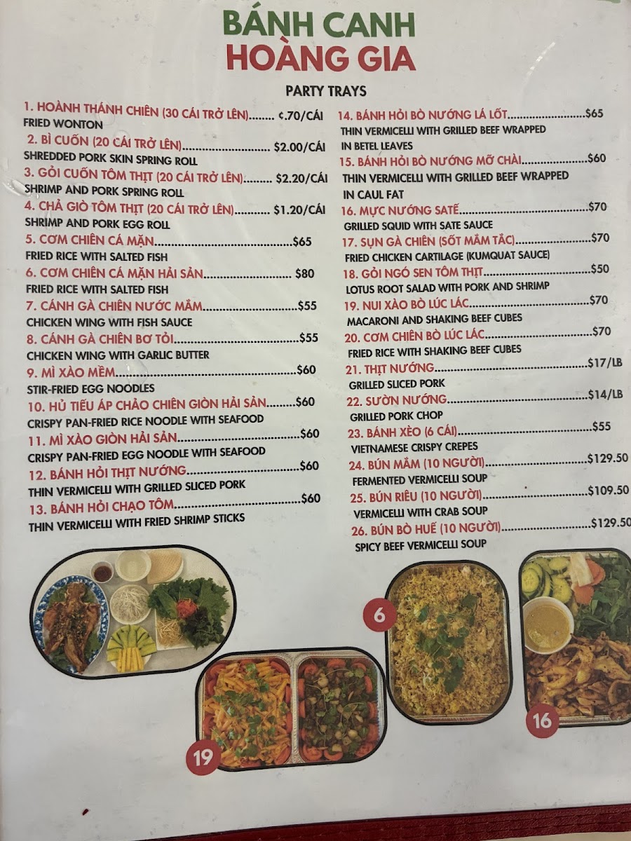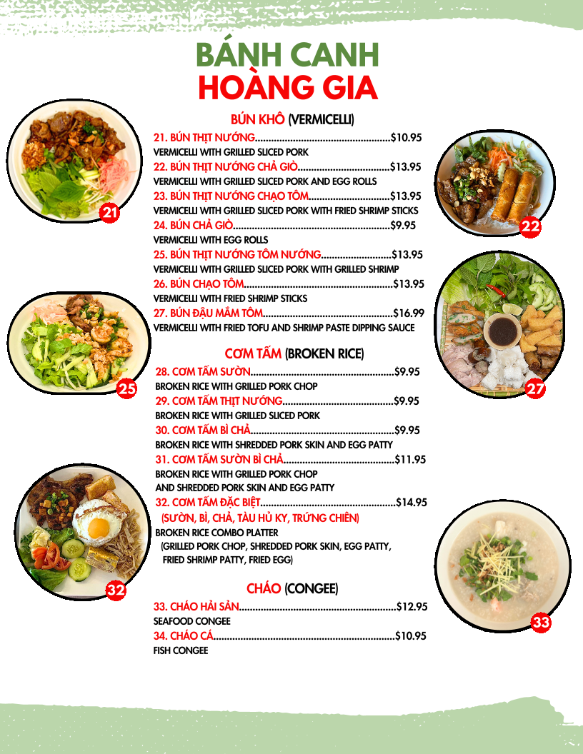 Overall, the menu at Hoàng Gia Quán offers a well-rounded and satisfying selection of Vietnamese classics, with standout dishes across multiple categories. The dry vermicelli bowls like Bún Thịt Nướng Chả Giò, Bún Chạo Tôm, and Bún Thịt Nướng Tôm Nướng deliver a balance of grilled meats and fresh textures, while the noodle soups such as Mì Hoành Thánh Hải Sản, Hủ Tiếu Mì Hải Sản, and Hoành Thánh Soup Hải Sản highlight rich, seafood-forward broths. For those craving bold flavors, the soups Bún Bò Huế and Bún Mắm provide depth and spice, complemented by comforting options like Cháo Hải Sản and Cháo Cá. The broken rice plates, especially Cơm Tấm Sườn Bì Chả and Cơm Tấm Đặc Biệt, are hearty and satisfying, while the beef stew variations such as Bánh Mì Bò Kho and Mì Bò Kho add a comforting, slow-cooked element. Interactive dishes like Thịt Nướng, Rau Sống, Bánh Tráng and Bò Lá Lốt, Mỡ Chài, Rau Sống, Bánh Tráng make for a fun dining experience, and lighter bites like Chả Giò, Hoành Thánh Chiên, and Cánh Gà Chiên Nước Mắm round out the meal nicely. Altogether, the menu showcases variety, authenticity, and something appealing for every type of diner.